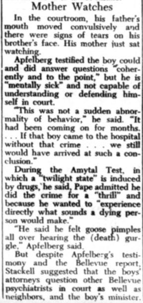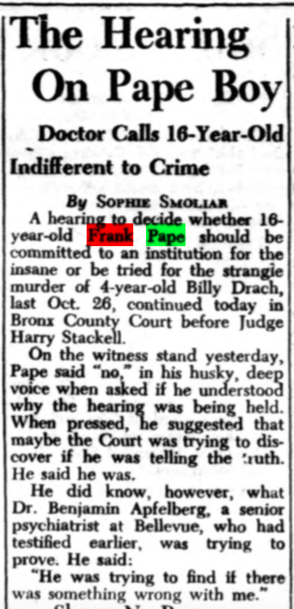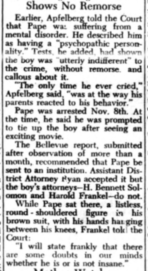 After a two-day sanity hearing in Bronx County Court, Frank Pape, 16 years old, who strangled William Drach, 4, last October in the basement of 825 Eagle Avenue, the Bronx, was committed yesterday to the Pilgrim State Hospital by Judge Harry Stackell. The boy’s attorneys, who at first had opposed the commitment, agreed that he needed mental care. The boy was found insane by the psychiatry staff of Bellevue Hospital. Dr. Morris Herman, assistant director of psychiatry at Bellevue, testified yesterday that Pape was abnormal and that he displayed “early manifestations of dementia praecox.” Judge Stackell said this convinced him Pape should be sent to a State hospital. The boy, according to psychiatrists, showed no remorse over the killing during the many tests they subjected him to.