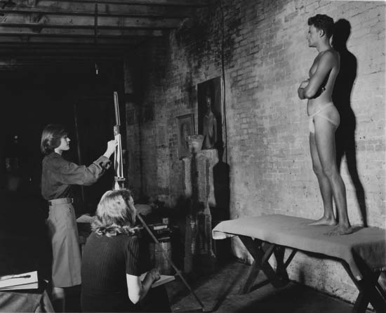 “Life Class.” Ferrotyped silver print, 6 3/4×8 1/4 inches (17.1×21 cm.), with the Acme Photo hand stamp and a mimeographed caption label on verso. 1946