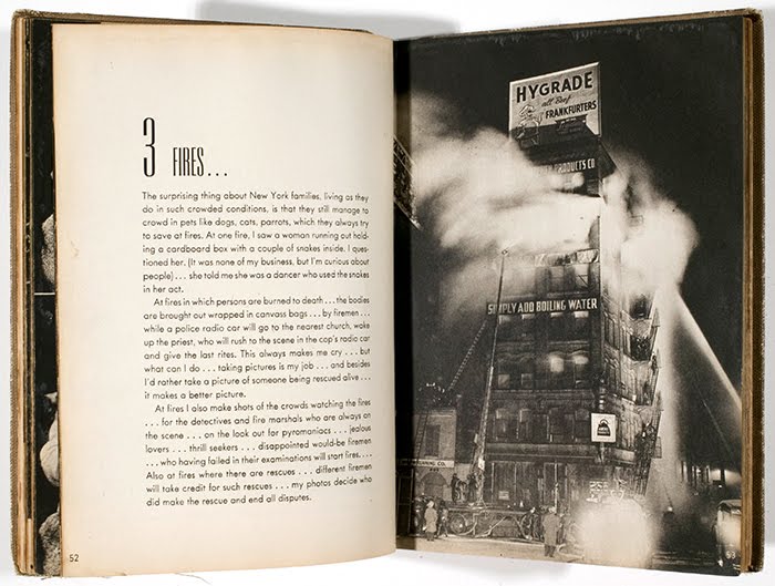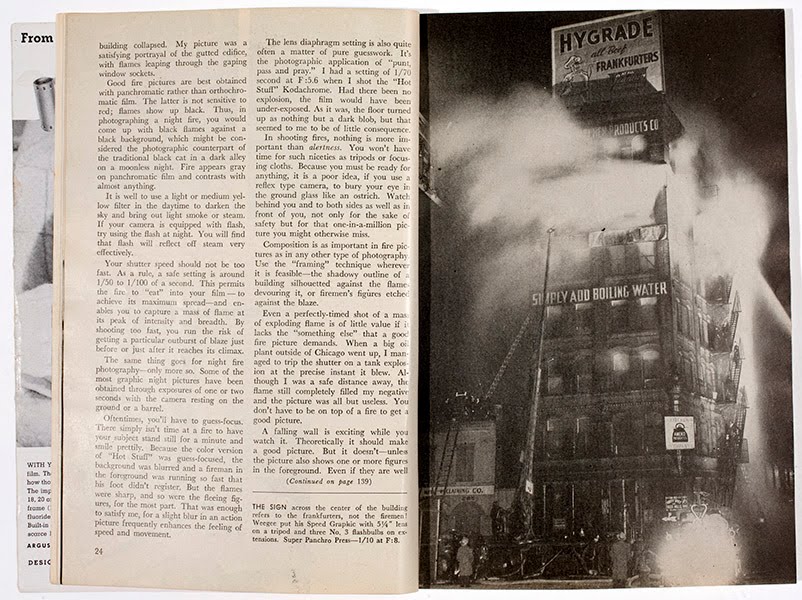 “The Sign across the center of the building refers to the frankfurters, not the firemen! Weegee put his Speed Graphic with 51/4″ lens on a tripod and three No. 3 flashbulbs on extensions. Super Panchro Pres – 1/10 at F:8”