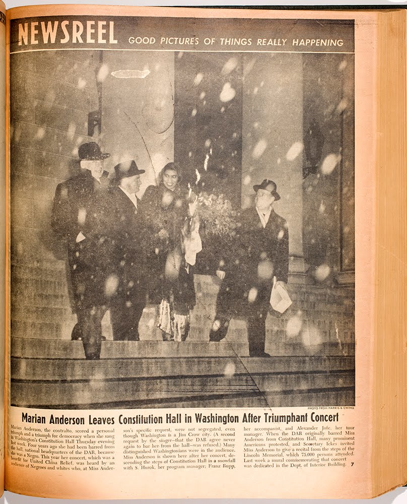 January 18, 20101943, Marian Anderson, PM Weekly Leave a comment Marian Anderson Leaves Constitution Hall in Washington After Triumphant Concert… Marian Anderson Leaves Constitution Hall in Washington After Triumphant Concert, photo from Harris and Ewing, PM Weekly, p. M7, January 1943