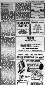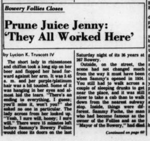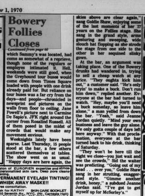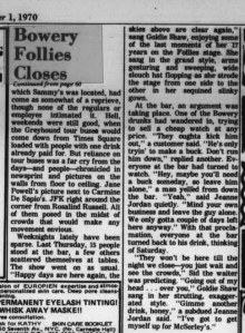 June 13, 20101970, Sammy's Bowery Follies Leave a comment "We only gotta couple of days left here anyway…" The closing of Sammy’s Bowery Follies was front page news in the Villiage Voice on October 1, 1970…