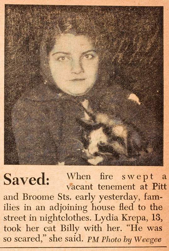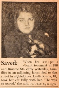 When fire swept a vacant tenement at Pitt and Broome Sts. early yesterday, families in an adjoining house fled to the street in nightclothes. Lydia Krepa, 13, took her cat Billy with her. “He was so scared,” she said. PM Daily, October 27, 1941