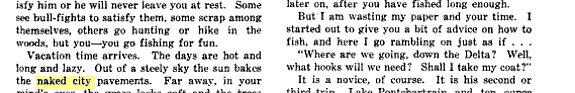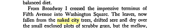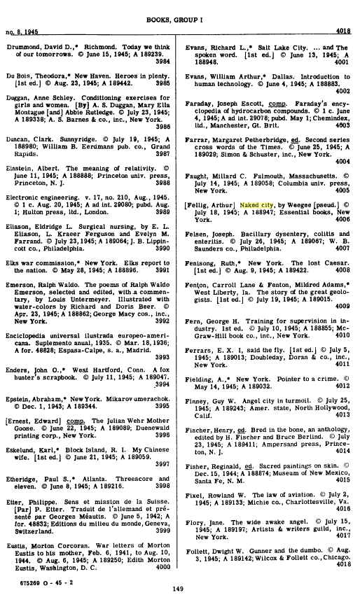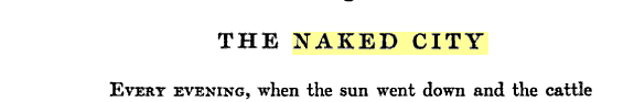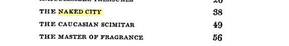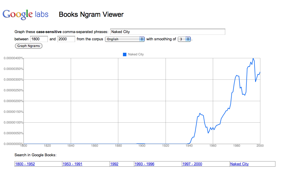 Wee were inspired to attend Google University… [Bad joke! eds. note] We were inspired to search for all of the uses of the phrase: “Naked City” in Google Books. Wee thought, foolishly, that Weegee coined the phrase. Apparently that’s not true… (Obviously, if you click on the image it will get bigger.) Here’s Google Books’ “Naked City” from the beginning to the end…
