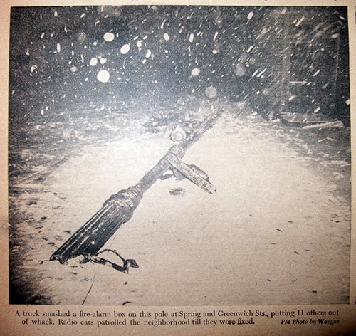 A truck smashed a fire-alarm box on this pole at Spring and Greenwich Sts. putting 11 others out of whack. Radio cars patrolled the neighborhood till they were fixed. PM photo by Weegee.