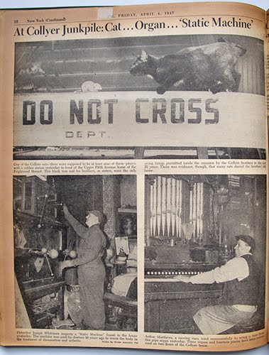 April 5, 20111947, cat, Collyer Brothers Leave a comment 64 years ago today: "One of the Collyer Cats – there were supposed to be at least nine of them plays with a rubber mouse…" PM Daily, 04/04/1947 “Three organs and fourteen pianos have been uncovered on two floors of the Collyer home.”