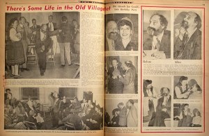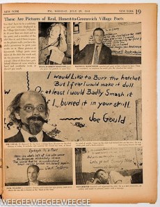 A poem by and portrait of Joe Gould is prominent in this amazing page of real, honest-to-Greenwich Village poets, at the Village Arts Center (1 Charles St.); (Maxwell Bodenheim refused to pose at first). Gould “has been working these 20 years on the Oral History of today. It contains only material Mr. Gould has seen, or heard by word of mouth. Verses on the club wall behind him are his own. He is a satiric poet and a book reviewer.”