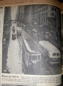 Buses replaced crosstown trolley cars on 42d St. yesterday, after the old-timers had operated since 1898. Above, one of the new buses, right, going West, passes a Broadway car which will also be replaced by buses soon. It’s all part of the City’s overall plan to eliminate street cars wherever possible.