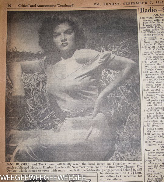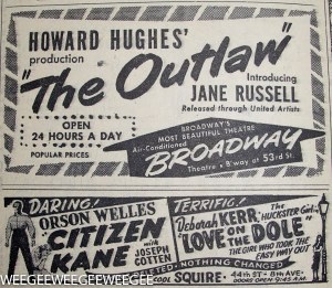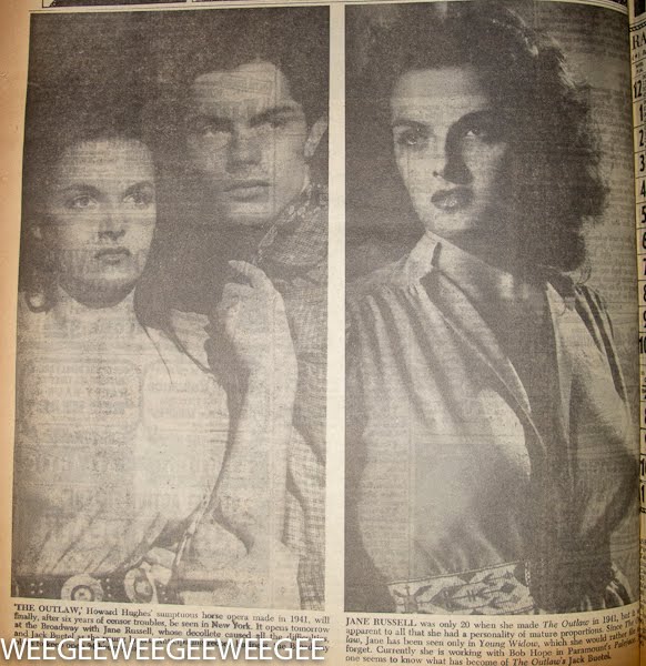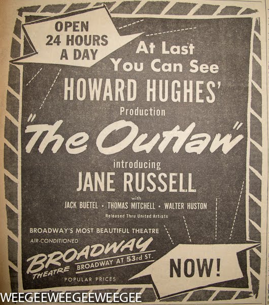 Jane Russell (June 21, 1921 – February 28, 2011) and The Outlaw will finally reach the local screen on Thursday, when the much-publicized Howard Hughes film has its New York premiere at the Broadway Theater. The Outlaw, which comes to town with more than 5,000 record-breaking engagements behind it, will be shown here on a 24-hour, round-the-clock schedule for an indefinite run.