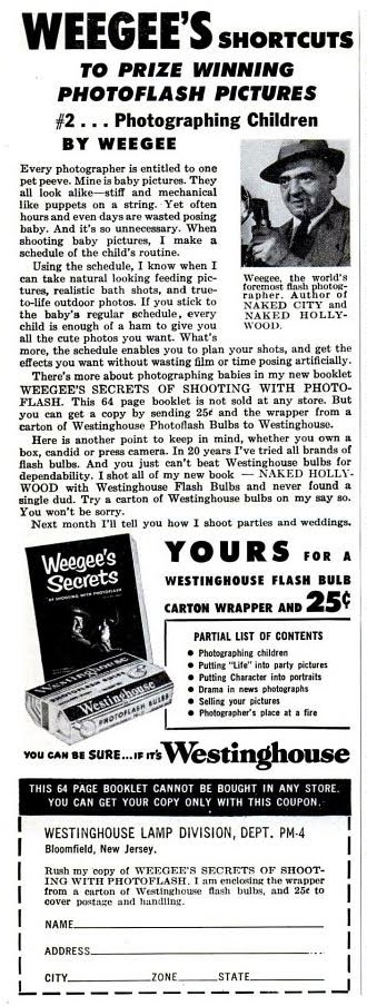September 8, 2011Uncategorized Leave a comment Weegee’s Shortcuts… #2 (from unknown magazine on Google books… Popular Mechanics maybe) Every photographer is entitled to one pet peeve. Mine is baby pictures. They all look alike – stiff and mechanical like puppets on a string…