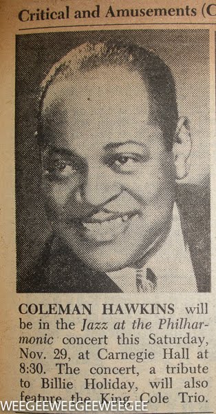 November 21, 2011music Leave a comment Coleman Hawkins! COLEMAN HAWKINSwill be in the Jazz at the Philharmonic concert this Saturday, Nov. 29, at Carnegie Hall at 8:30. The concert, a tribute to Billie Holiday, will also feature the King Cole Trio. Happy Birthday Coleman Hawkins!
