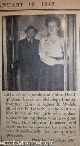 “Girl elevator operators at Police Headquarters break an old departmental tradition. Here is Agnes E. Welch, 20, of 600 E. 141st St., at the controls. She is one of two girls who replace men civilian employes who have gone to war. One elevator, however, will be continue to be operated by men; it is used exclusively for transporting prisoners. Photo by John Albert, PM