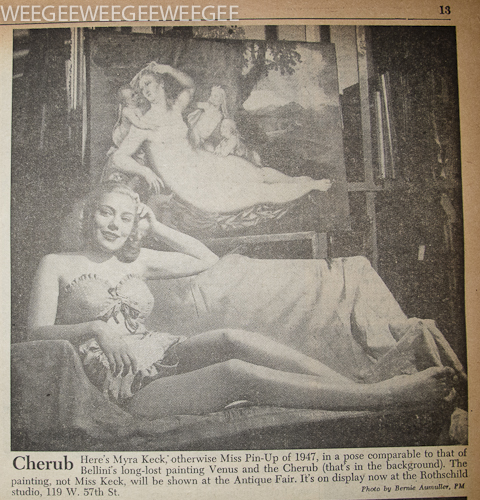 Here’s Myra Keck, otherwise Miss Pin-up of 1947, in a pose comparable to that of Bellini’s long-lost painting Venus and the Cherub (that’s in the background). The painting, not Miss Keck, will be shown at the antique Fair. It’s on display now at the Rothschild studio, 119 W. 57th St.