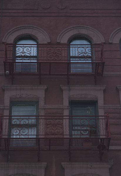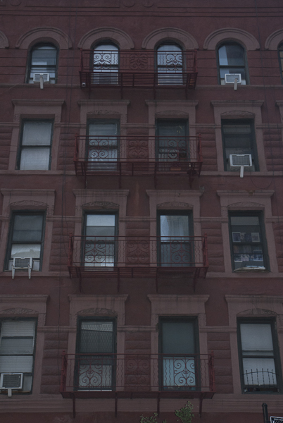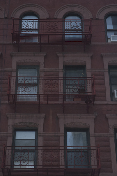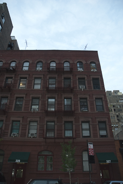 The uncommon circular decoration on the corner of the fire escape, in the forground of the Weegee photo, made the exact location of this photo easy to find. Weegee must have climbed up to the (perhaps) third floor of 327 (or perhaps 329) 35th St., and facing west, or away from Manhattan Center, and very close to NYPD’s Midtown Precinct South, made the photo that was published…