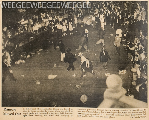 Dancers Moved Out to 35th Street when Manhattan Center was forced to close its doors on a terrific crowd. Music was piped to sound trucks and the crowd in the street held its dance right there. Dancing was mixed with horseplay as aluminum pots sailed through the air in every direction. It took 50 cops to send the enthusiasts home, but it was all good fun. OPM told housewives that 5000 dishpans mean the U.S.A. can build one fighter plane, 2000 roasters and 2500 double boilers build two more planes. PM Photo by Weegee