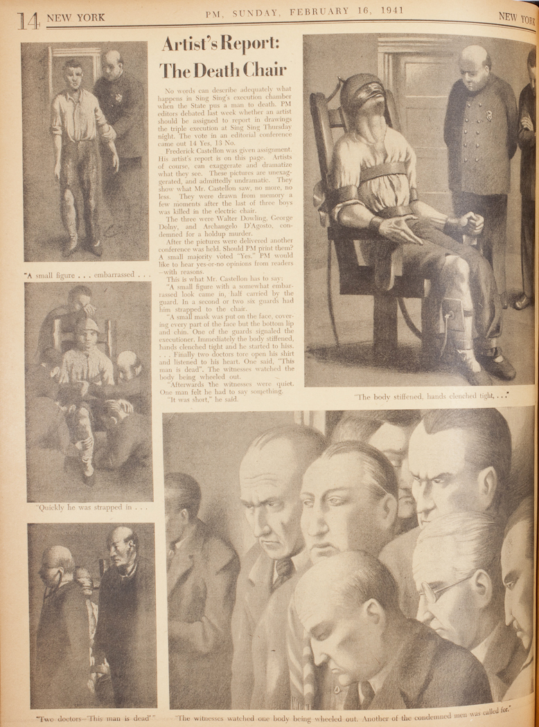 February 16, 20131941 The Death Chair… 1941 PM Daily, February 16, 1941 “No words can describe adequately what happens in Sing Sing’s execution chamber when the State puts a man to death…” Drawings by Frederick Castellon. Oral history interview with Federico Castellon, 1971 1941death penaltyelectric chairSing Sing