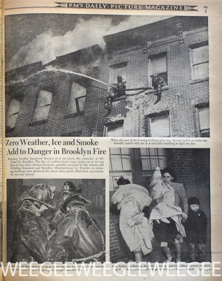 Weegee Daily… February 16, 1943… Zero Weather, Ice and Smoke Add to Danger in Brooklyn Fire Original size at 316 × 400