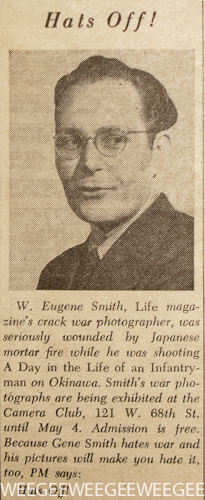 May 1, 20131946 67 Years Ago Today… Hat’s Off to Gene Smith! PM Daily, May 1, 1946 “Because Gene Smith hates war and his pictures will make you hate it, too, PM says: Hats Off!“ 1946Gene Smith