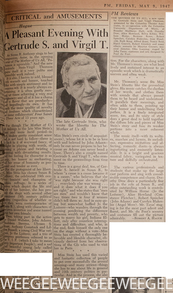 May 9, 20131947 66 Years Ago Today… “A Pleasant Evening With Gertrude S. and Virgil T.” PM Daily, May 9, 1947 1947Gertrude SteinThe Mother of Us All