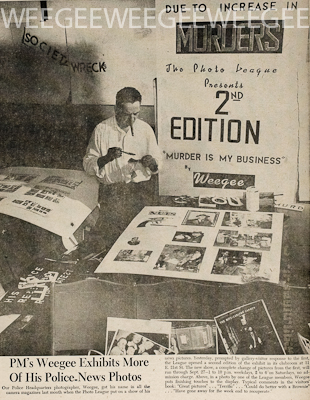 “Our Police Headquarters photographer, Weegee, got his name in all the camera magazines last month when the Photo League put on a show of his news pictures. Yesterday, prompted by gallery-visitor response to the first, the league opened a second edition of the exhibit in its clubroom at 31 E. 21st St. The new show, a complete change of pictures from the first…… Above, in a photo by one of the League members, Weegee puts finishing touches to the display. Typical comments in the visitors’ book: “Great pictures”… “Terrific”… “Could do better with a Brownie”… “Have gone away for the weekend to recuperate.””