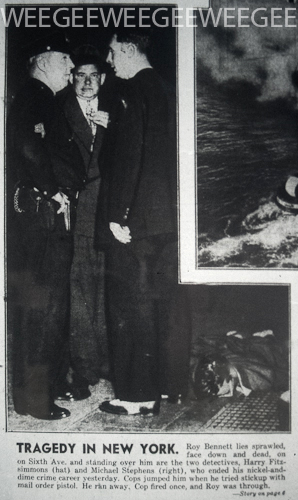 Bandit Roy Bennett, 27, was slain by detectives when he tried to escape after attempting to hold up the New York Delicatessen, 1288 Sixth Ave. He had arrived from Texas by bus a few hours earlier, apparently planning to try his hand as a big-city desperado.