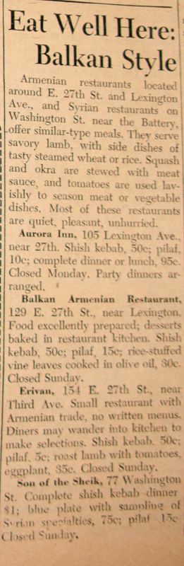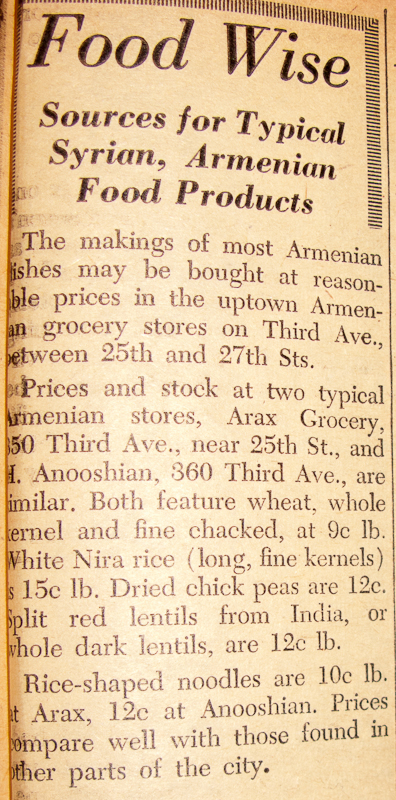 “The makings of most Armenian dishes may be bought at reasonable prices in the uptown Armenian grocery stores on Third Ave., between 25th and 27th Sts…”