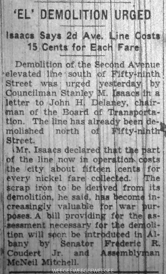 February 3, 20141942 The Second Ave. El to be razed… pushed to the wrecking ball… NY Daily News, February 3, 1942 NY Times, February 3, 1942 1942elWWII