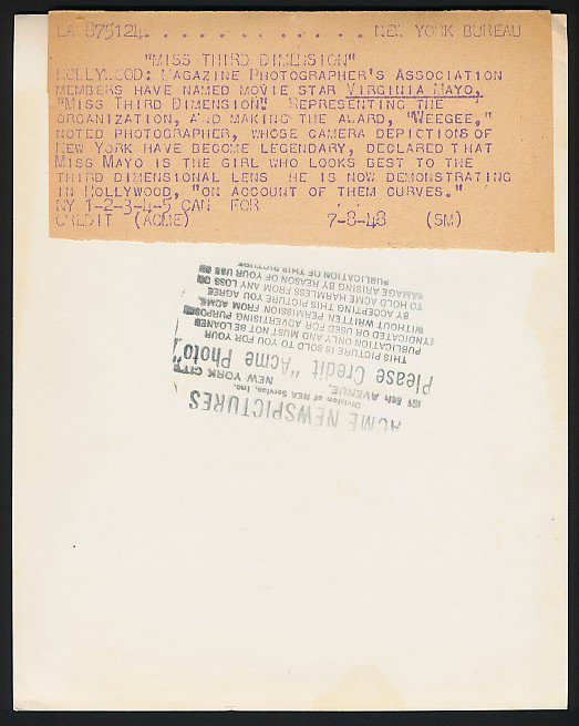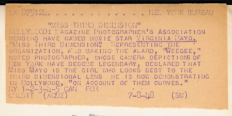 Representing the organization, and making the award, “Weegee,” noted photographer, whose camera depictions of New York have become legendary, declared that Miss Mayo is the girl who looks best to the third dimensional lens he is now demonstrating in Hollywood, “On account of them curves.”