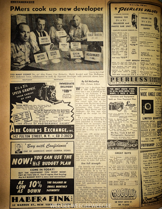 We’ve got a developer here at PM called Algumati. First time I saw it labeled on the crocks in our darkroom, I was impressed. It looked Latin and very scientific. It fooled me completely. For, actually, the name was coined right here on the premises from the first two letter of the names of our darkroom technicians – Alex Fraser,Gus Rickarby, Marty Kunkel and Tim Hoffmann -the four men who cooked up the recipe for this soup.