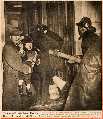 Weegee Daily… March 19, 1941… Tenement Fire On Lower East Side Drives 50 Families Into Cold… Original size at 432 × 500