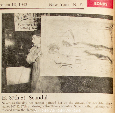 Naked as the day her creator painted her on canvas, this beautiful thing leaves 167 E. 37th St. during a fire there yesterday. Several other paintings were rescued from the flames.”