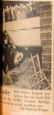 (Interestingly Weegee had another and perhaps equally unknown photo published in PM, on November 17, 1941… “Lucky Phil Falco leaped just before his car took this dive off the Willis Avenue Bridge. He swerved to avoid another car.