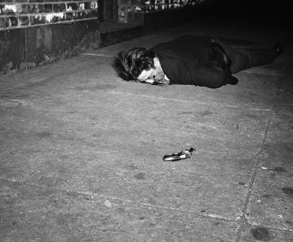 Weegee, “Off Duty Cop Does Duty, Kills Gunman Who Tries Stickup,” February 3, 1942