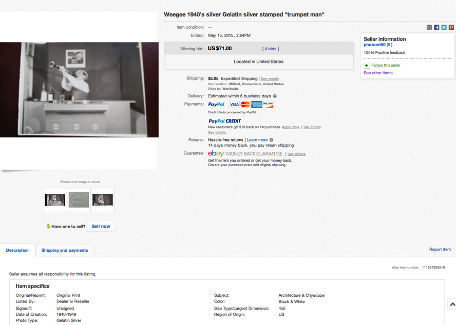 Weegee on eBay, June, 2015… (part 1) – “Weegee 1940’s silver Gelatin silver stamped “trumpet man”