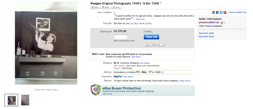 Since this is an online filing cabinet let’s look quickly at a few recent (June 6, 2015) Weegee on eBay results, and file this under auctions…
