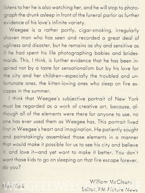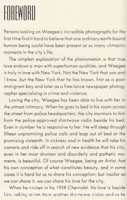 The simplest explanation of the phenomenon is that true love endows a man [or woman] with superhuman qualities, and Weegee is truly in love with New York. Not the New York that you and I know, but the New York that he has known, first as a poor immigrant boy and later as a free-lance newspaper photographer specializing in crime and violence.