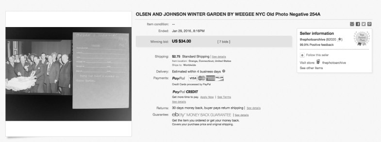 Recent auction: “OLSEN AND JOHNSON WINTER GARDEN BY WEEGEE…” – negative.