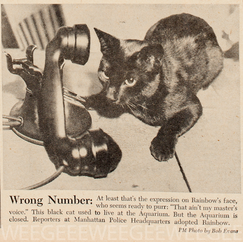“Wrong Number: At least that’s the expression on Rainbow’s face, who seems ready to purr: “That ain’t my master’s voice.” This black cat used to live at the Aquarium. But the Aquarium is closed. Reporters at Manhattan Police Headquarters adopted Rainbow. PM Photo by Bob Evans.”