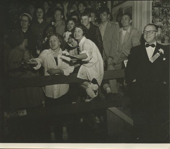 “…Hollywood Autograph Seekers, circa 1952. Vintage gelatin silver print, 4 x 5 inches. Printed circa 1952. No Weegee ink credit stamp…”