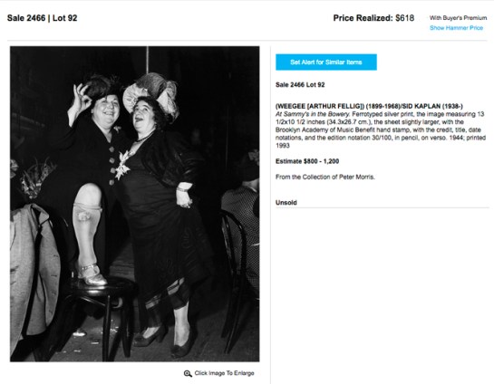 At Sammy’s in the Bowery. Ferrotyped silver print, the image measuring 13 1/2×10 1/2 inches (34.3×26.7 cm.), the sheet slightly larger, with the Brooklyn Academy of Music Benefit hand stamp, with the credit, title, date notations, and the edition notation 30/100, in pencil, on verso. 1944; printed 1993