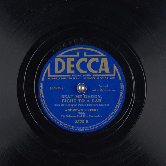 Andrews Sisters; Beat Me Daddy, Eight to a Bar; Andrews Sisters; Vic Shoen And His Orchestra; Don Raye; Hughie Prince; Eleanore Sheehy; 1940; Decca 3375 B
