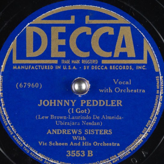 Andrews Sisters, Johnny Peddler (I Got), Andrews Sisters; Vic Schoen And His Orchestra; Lew Brown; Laurindo De Almeida; Ubirajara Nesdan; August 3, 1940