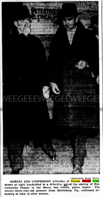 “…by forging his mother’s name to an excuse for absence at school. Now at 23 George Joseph Cvek, a pock-marked hitch-hiker, finds himself handcuffed between detectives behind bars – a confessed thief, rapist and killer (On pages 12 and 13, his clinical profile.) PM Pohoto by Weegee.”