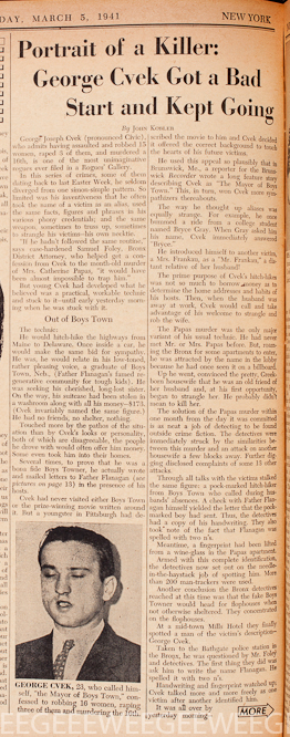 George Joseph Cvek, described by the NY Times as a 23-year-old “hitch-hike robber,” was arrested Monday, March 3, 1941 in a ” in a cheap midtown Manhattan hotel” (New Mills Hotel at 36th and 7th Ave., WI sconson 7-3254)…