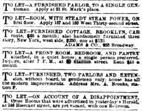 “To Let – A front room, bedroom, and pantry attached, in a quiet house; a single person preferred. … Rent $40 a month.”