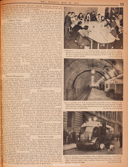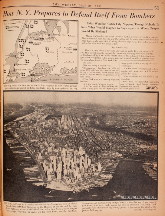 To sum up: The City Fathers are by no means unaware of the possible dangers to New York in the event of war, and they are preparing to meet them. Probably a larger part of the plans have not yet been made public, Some of them never will be. But if the ominous buzz of enemy aircraft ever sounds over New York the city won’t be caught with its guard down.”