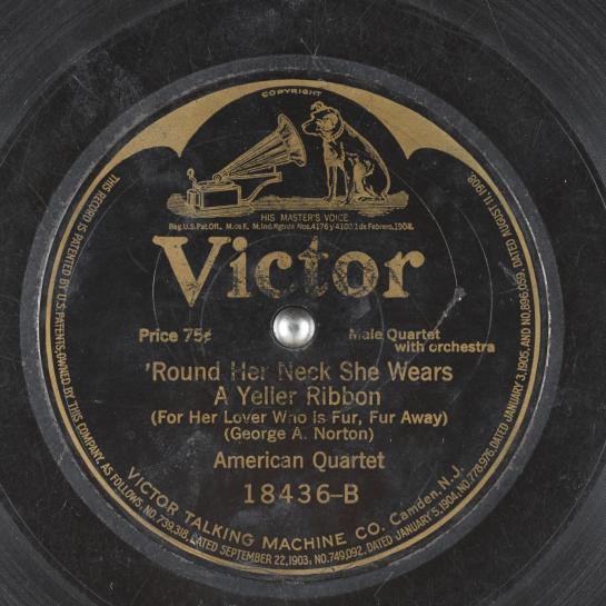‘Round Her Neck She Wears A Yeller Ribbon (For Her Lover Who is Fur, Fur Away). American Quartet; George A. Norton. Victor (18436-B).