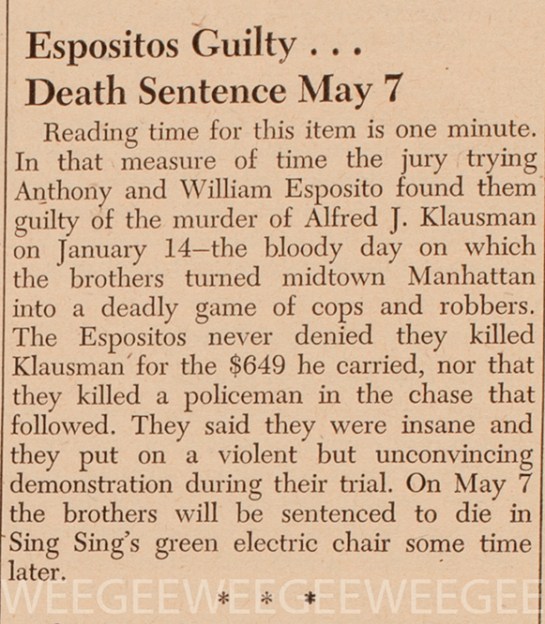 (Anthony Esposito and William Esposito found guilty of murder… Ann Corio (and Ed Sullivan), and a diminished May Day Parade…)