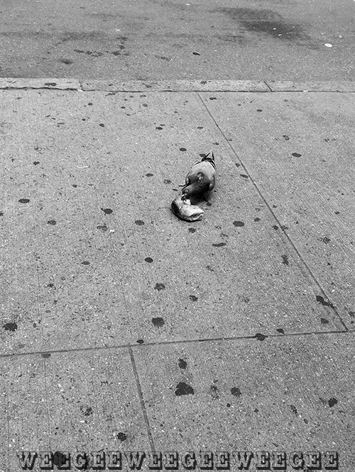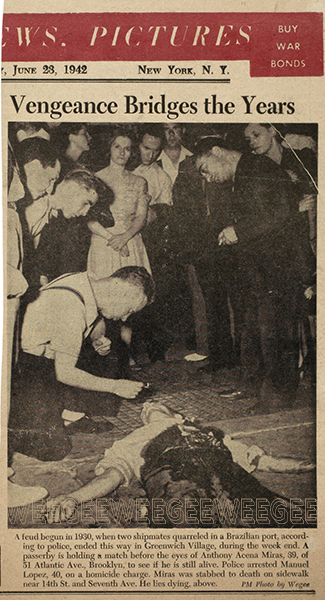 Feud begun in 1930, when two shipmates quarreled in a Brazilian port, according to police, ended this way in Greenwich Village, during the week end. A passerby is holding a match before the eyes of Anthony Acena Miras, 39, of 51 Atlantic Ave., Brooklyn, to see if he is still alive. Police arrested Manuel Lopez, 40, on a homicide charge. Miras was stabbed to death on sidewalk near 14th St. and Seventh Ave. He lies dying, above. PM Photo by Weegee