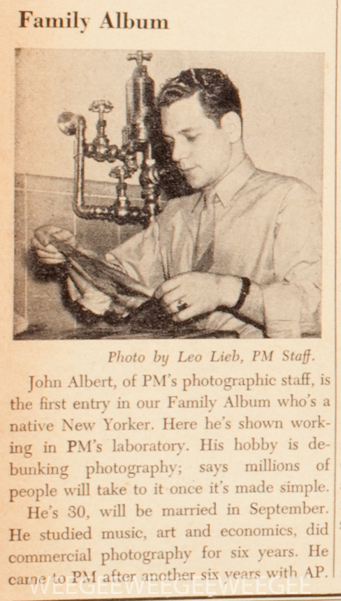 John Albert, of PM’s photographic staff, is the first entry in out Family Album who’s a native New Yorker. Here he’s shown working in PM’s laboratory… Photo by Leo Lieb, PM Staff
