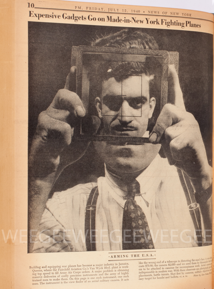 Building and equipping war planes has become a major industry in Jamaica, Queens… The instrument is the view finder of an aerial military camera. It acts like the wrong end of a telescope in distorting the man’s face… Aerial cameras are indispensable in modern war… Photo by Alan Fisher.